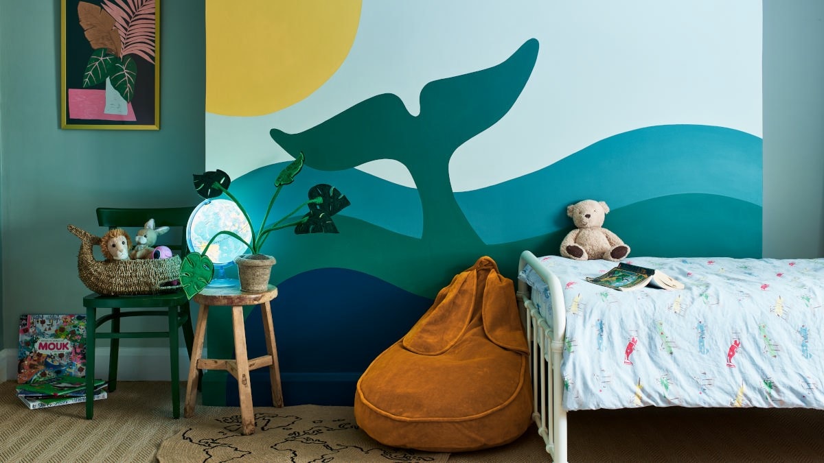 Colori armoniosi sono disposti sulla ruota uno vicino all’altro e creano un look coordinato e sfumato. Gli ambienti con questi colori applicati risultano spesso calmi e rilassanti. Nella cameretta di questo bambino sono combinati tra loro i toni del blu e del verde in un divertente murale ispirato alla bellezza dell'oceano.